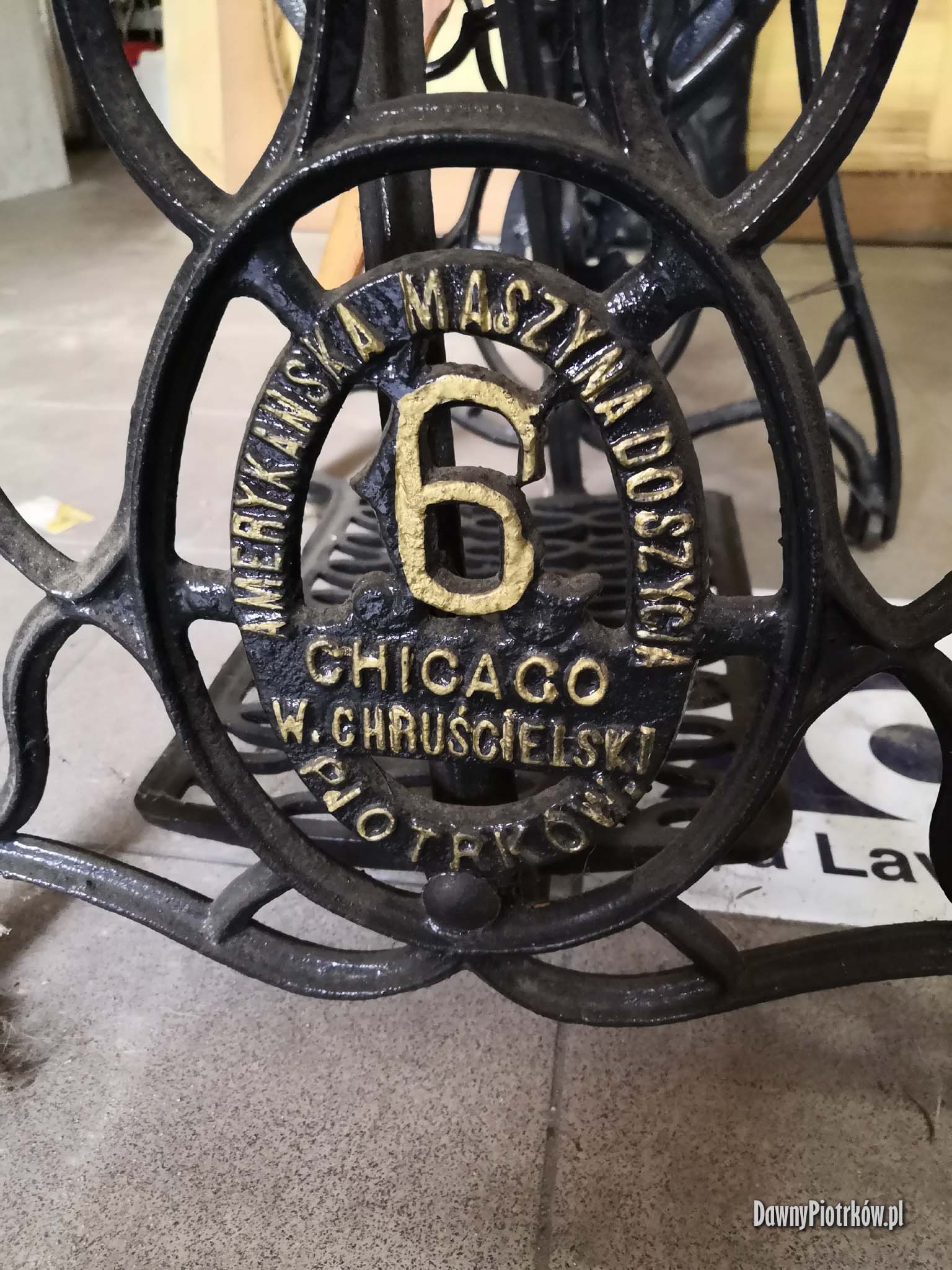 Maszyna do szycia wyprodukowana w firmie W. Chruścielskiego. Maszyna pochodzi ze zbiorów Pani Wacławy Ryszki.