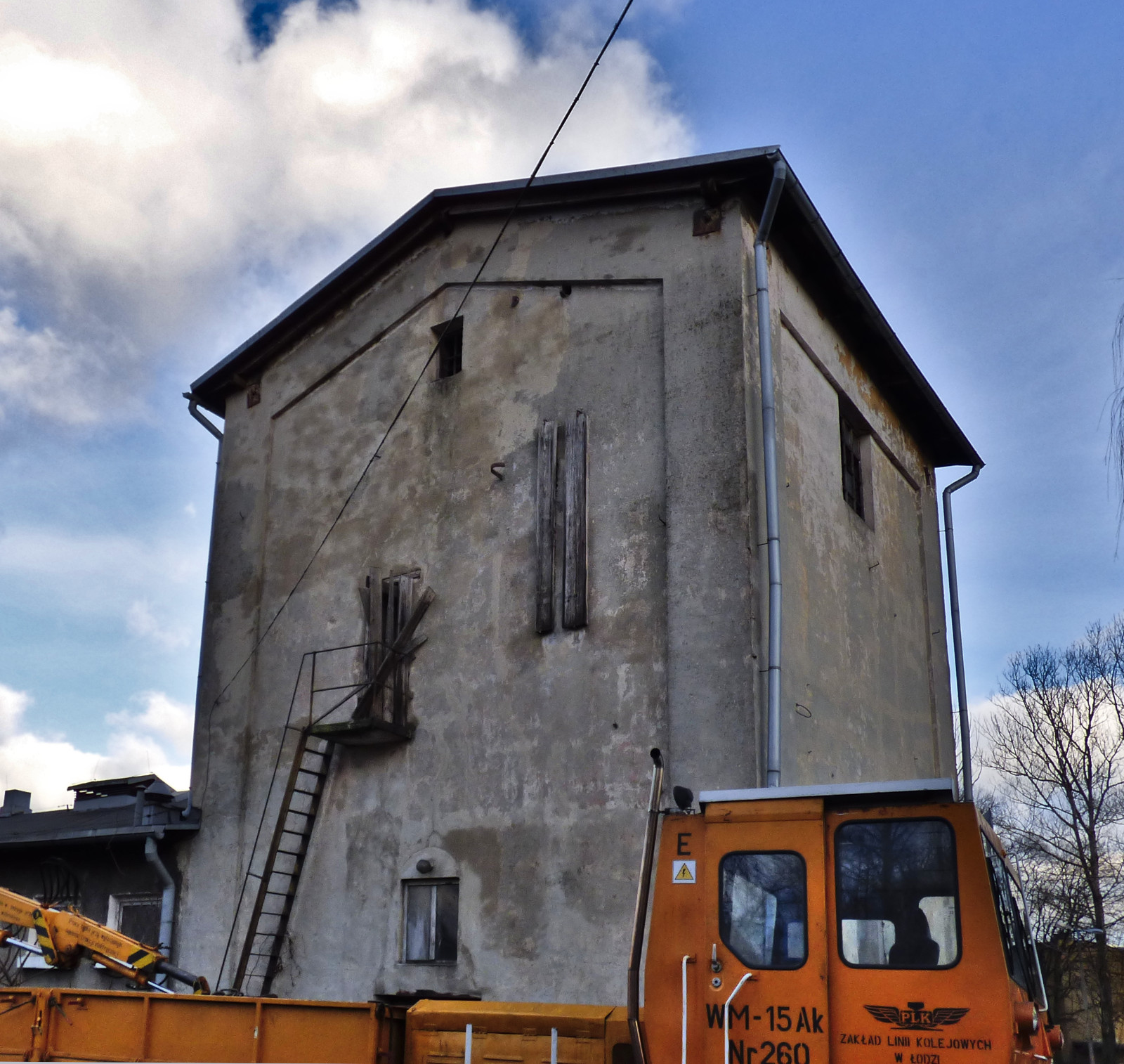 Kolejowa wieża ciśnień naprzeciwko dworca. Na ścianie zewnętrznej widać resztki wskaźnika poziomu wody