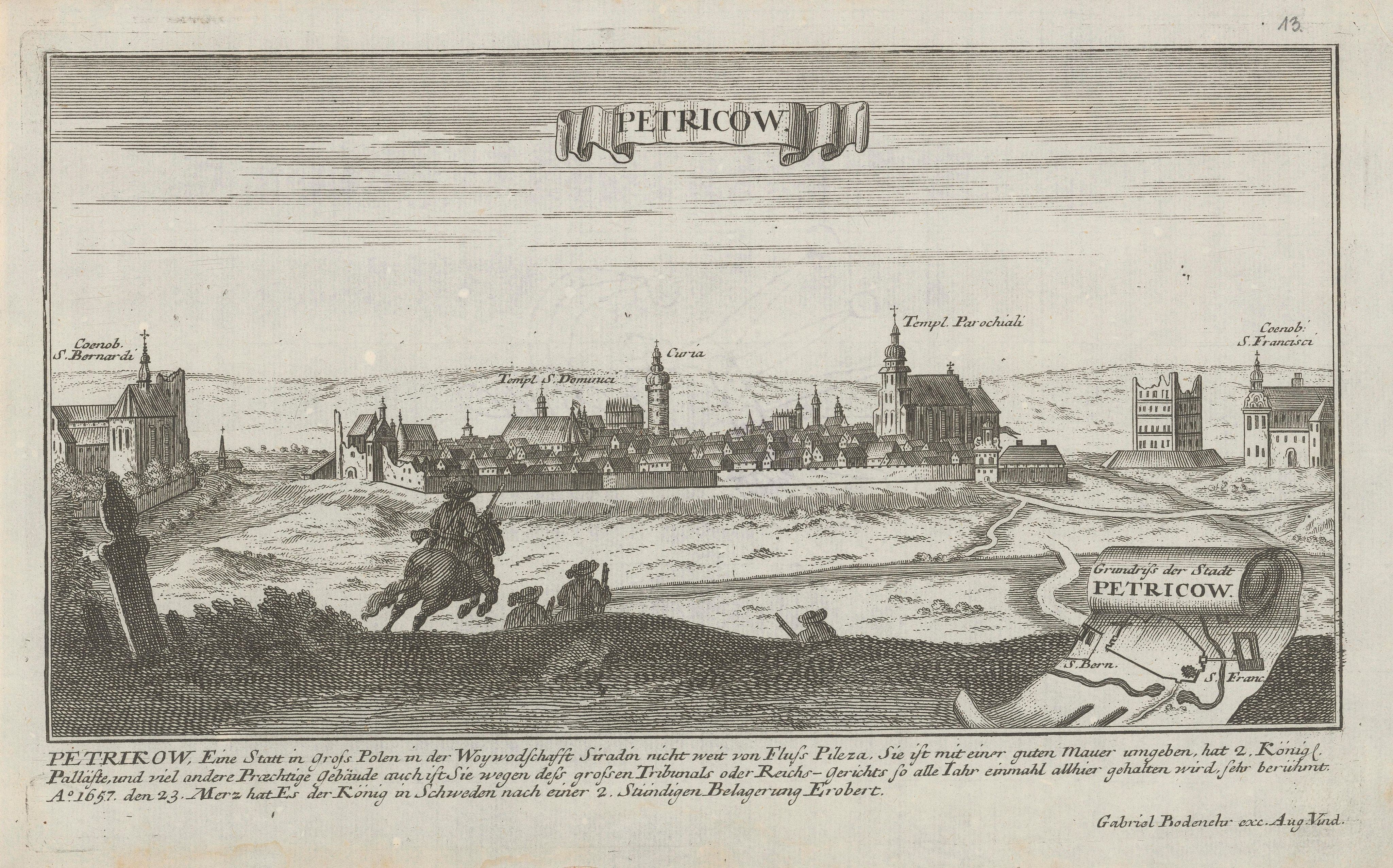 Bodenehr Gabriel - miedziorytnik, prawdopodobnie żył w latach 1673-1766 lub 1664-1758. Wydał księgę Force d'Europe zawierającą 200 widoków i planów, wśród których znalazła się rycina Piotrkowa przedstawiająca uproszczoną wersję słynnej panoramy Dahlberga.