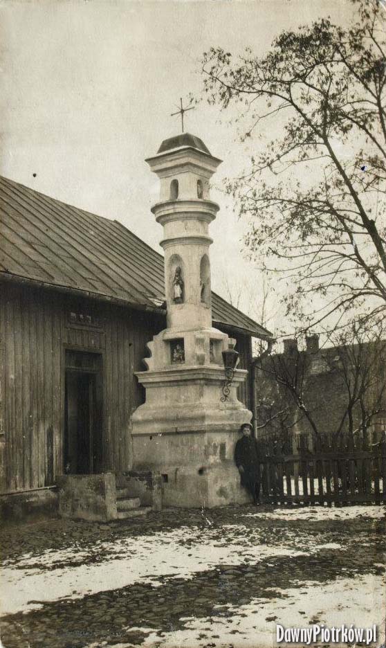 Fotografia kapliczki przy ul. Krzywej. Przedstawia p. Aleksandra Knapika, przed domem swojego dziadka Stefana Penciny. |