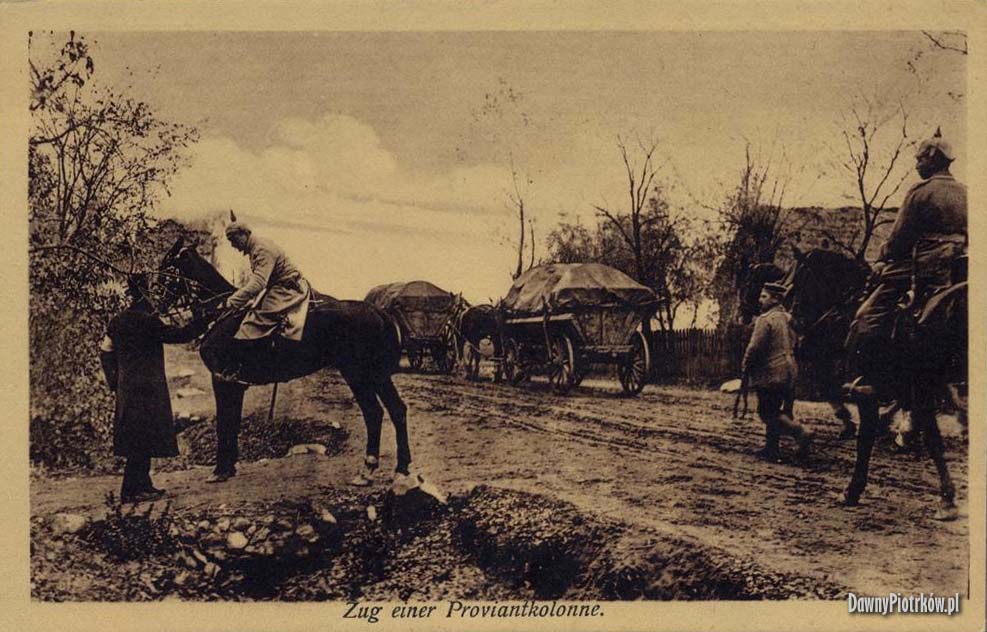 Zug einer Proviantkolonne durch eine russische Ortschaft zwischen Lodz und Petrikau. Zaopatrzenie wojska. Droga pomiędzy Łodzią a Piotrkowem.