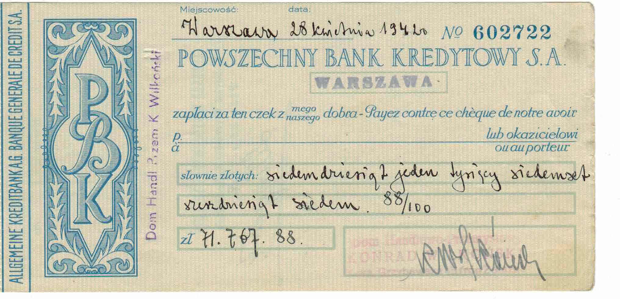 Czek wystawiony przez Leonarda Kopydłowskiego