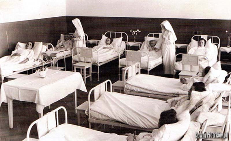 Sala chorych w Szpitalu Miejskim. Chorzy obsługiwani prze Siostry Służebniczki. Artykuł nt. działalności Sióstr Służebniczek w Piotrkowie Trybunalskim.