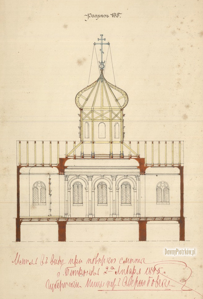 Projekt dobudowania kopuły cerkiewnej do Kolegium Jezuitów. Przekrój wzdłużny. Projekt wykonany 27.12.1894r, i zatwierdzony 4.01.1895r.